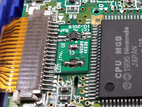 esta placa se encaixa no capacitor de buffer de 100nF próximo à CPU do GBP. existem almofadas de solda na placa de circuito para soldar a este capacitor, que fornece acesso ao GND e energia. a partir daqui, você usa as 4 guias de solda na borda do circuito para conectar ao LCD e aos pinos da CPU. o sinal então passa por esse circuito e fornece o efeito invertido.